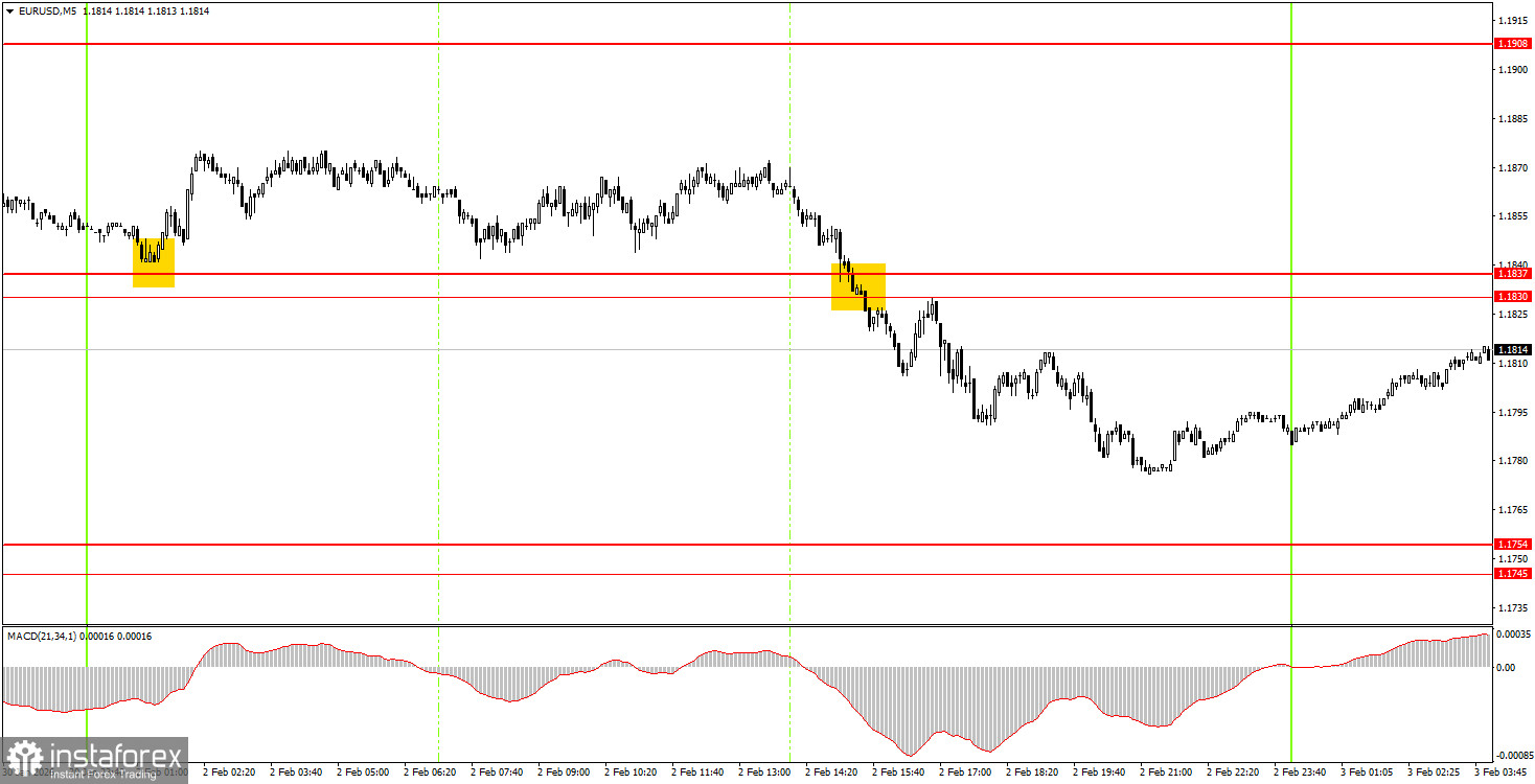 На 5-минутном ТФ в понедельник был сформирован один торговый сигнал. Цена преодолела область 1,1830-1,1837 на американской сессии, что позволило трейдерам открывать короткие позиции. Целевая область 1,1745-1,1754 достигнута не была, поэтому получить прибыль по сделке можно было только в случае ее ручного закрытия.