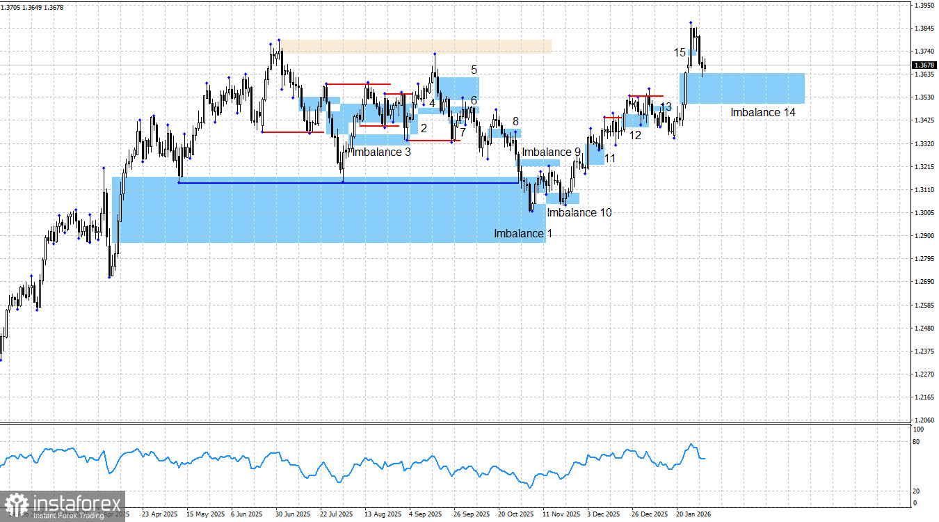 Так как «бычий» тренд неоспорим, трейдерам остается только торговать на повышение из понятных паттернов и по понятным сигналам. Уже в ближайшее время трейдеры могут рассчитывать на образование нового «бычьего» сигнала внутри имбаланса 14. В качестве цели потенциального роста я рассматривал уровень 1,3725, этот уровень был достигнут, но британец может подняться гораздо выше в 2026 году. Пределов – нет. Особенно, учитывая события первого месяца года. При образовании «медвежьих» паттернов, сделки на продажу также возможны, но на «бычьем» тренде я являюсь приверженцем покупок, а не продаж.
