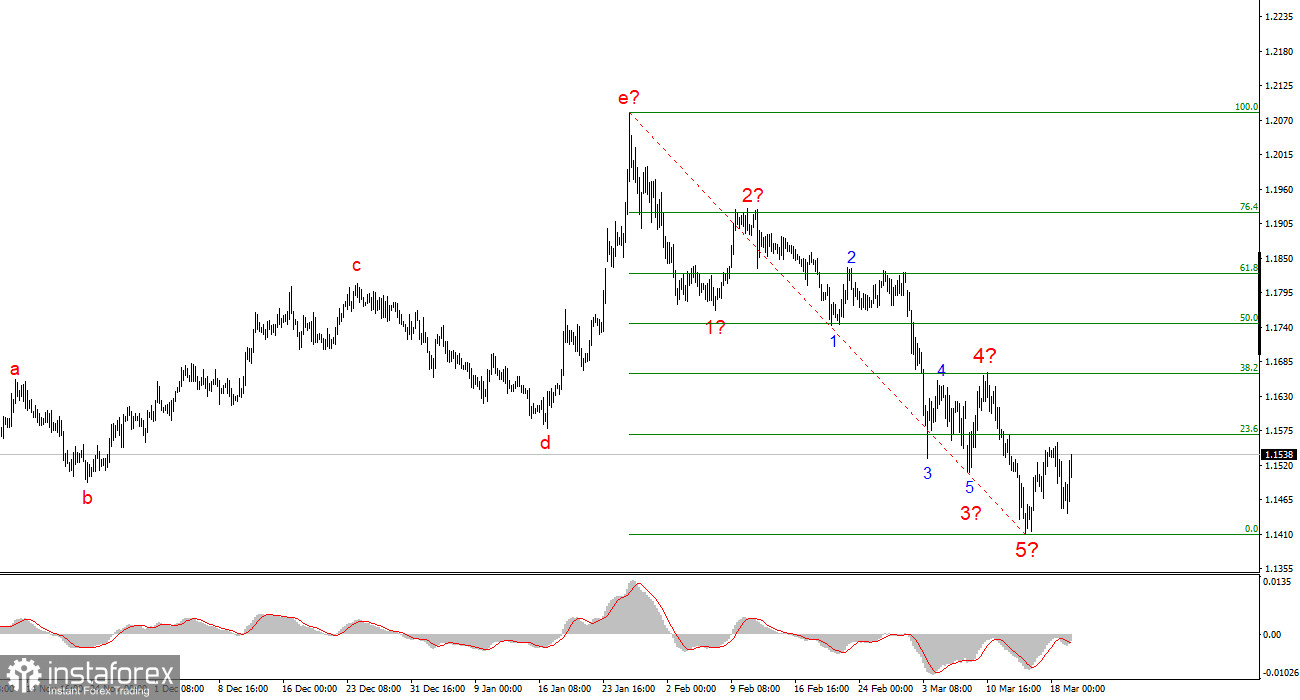 Волновая картина инструмента GBP/USD приобрела очень сложный, нечитаемый вид. Теперь мы видим на графиках семиволновую понижательную структуру, которая, безусловно, таковой не является. Вероятнее всего, внутри одной из волн присутствует удлинение или усложнение. Однако понятнее от этого волновая разметка не становится. Если волновая картина один раз усложнилась до нечитаемого вида, то может усложниться и еще несколько раз. Поэтому я считаю, что сейчас нужно опираться на волновую разметку инструмента EUR/USD, которая выглядит гораздо более понятно. Также не следует забывать о факторе геополитики, который в любой момент может отправить оба инструмента в новое падение. Если этого не произойдет, евро и фунт могут рассчитывать на повышение в рамках коррекции.