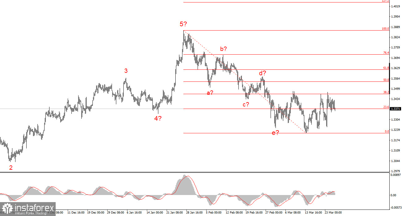 Волновая картина инструмента GBP/USD приобрела очень сложный, нечитаемый вид. Теперь мы видим на графиках семиволновую понижательную структуру, которая, безусловно, таковой не является. Вероятнее всего, внутри одной из волн присутствует удлинение или усложнение. Однако понятнее от этого волновая разметка не становится. Если волновая картина один раз усложнилась до нечитаемого вида, то может усложниться и еще несколько раз. Поэтому я считаю, что сейчас нужно опираться на волновую разметку инструмента EUR/USD, которая выглядит гораздо более понятно. Поэтому от британца я также жду повышения с целями, расположенными около отметок 1,3541 и 1,3620. Также не следует забывать о факторе геополитики, который в любой момент может отправить оба инструмента в новое падение.
