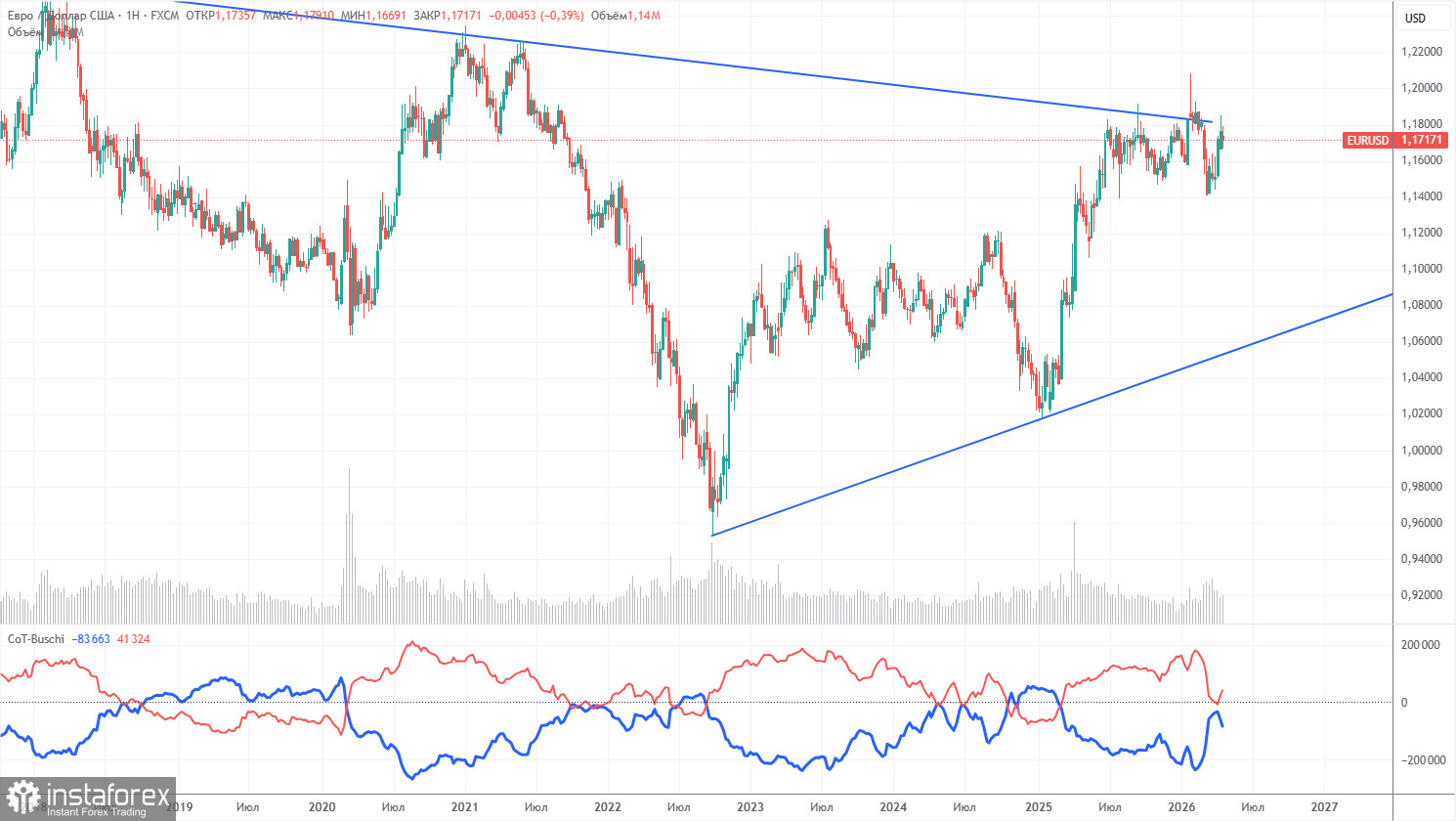 Последний отчет COT датирован 21 апреля. На иллюстрации недельного ТФ отлично видно, что нетто-позиция некоммерческих трейдеров остается «бычьей», но стремительно снижается из-за геополитических событий. Трейдеры избавлялись в последние месяцы от европейской валюты в пользу доллара США. Политика Дональда Трампа не изменилась, но доллар выступал некое время «резервной валютой». Впрочем, этот процесс может быть уже позади.