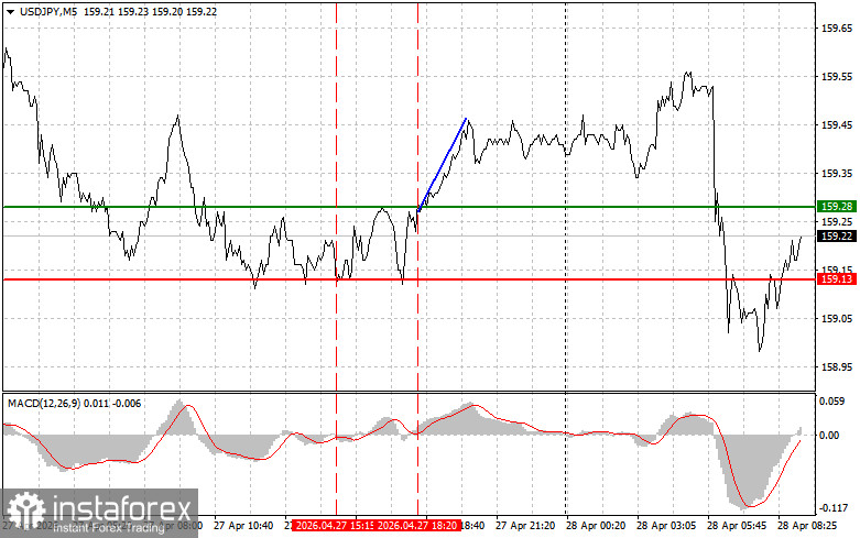 Сценарий №2: продавать USD/JPY сегодня также планирую в случае двух подряд тестов цены 159.28 в момент, когда индикатор MACD будет находиться в области перекупленности. Это ограничит восходящий потенциал пары и приведет к обратному развороту рынка вниз. Можно ожидать снижения к противоположному уровню 159.13 и 158.80.