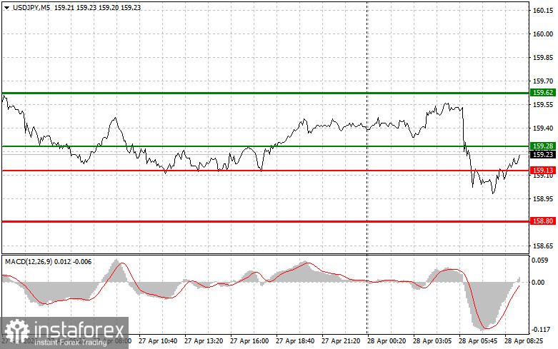 Сценарий №2: покупать USD/JPY сегодня также планирую в случае двух подряд тестов цены 159.13 в момент, когда индикатор MACD будет находиться в области перепроданности. Это ограничит нисходящий потенциал пары и приведет к обратному развороту рынка вверх. Можно ожидать рост к противоположным уровням 159.28 и 159.62.