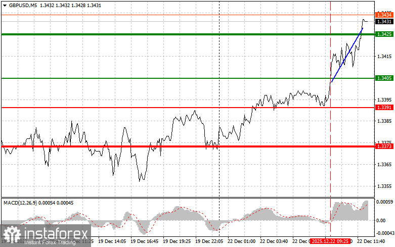 Тест цены 1.3405 пришелся на момент, когда индикатор MACD только начинал движение вверх от нулевой отметки, что стало подтверждением правильной точки входа на покупку фунта. В результате пара выросла в район целевого уровня 1.3425.