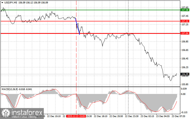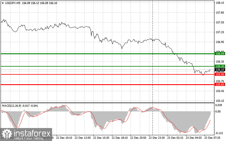 Сценарий №2: покупать USD/JPY сегодня также планирую в случае двух подряд тестов цены 155.95 в момент, когда индикатор MACD будет находиться в области перепроданности. Это ограничит нисходящий потенциал пары и приведет к обратному развороту рынка вверх. Можно ожидать рост к противоположным уровням 156.20 и 156.59.