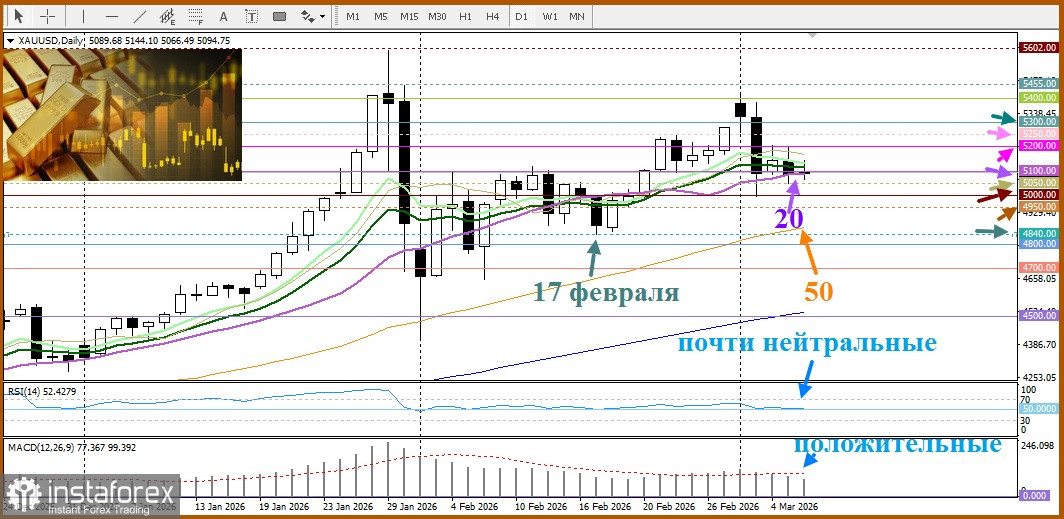 В противоположном сценарии, если цена золота закрепится выше 5100 долларов, первым значимым сопротивлением выступит максимум 4 марта на $5206, затем барьером может оказаться уровень $5250, а далее в фокус вернется область $5300 как следующая круглой величины цель для «быков».