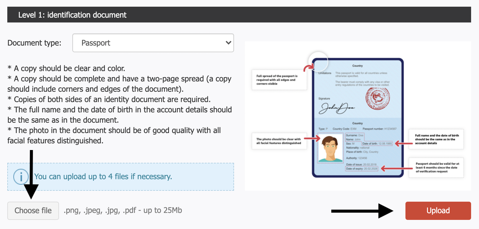 Please make sure that files uploaded for verification have the right format. Accepted file types are .png, .jpeg, .jpg, .gif and .pdf. The total size of the files should not exceed 25 Mb and the resolution should be more than 400 pixels.