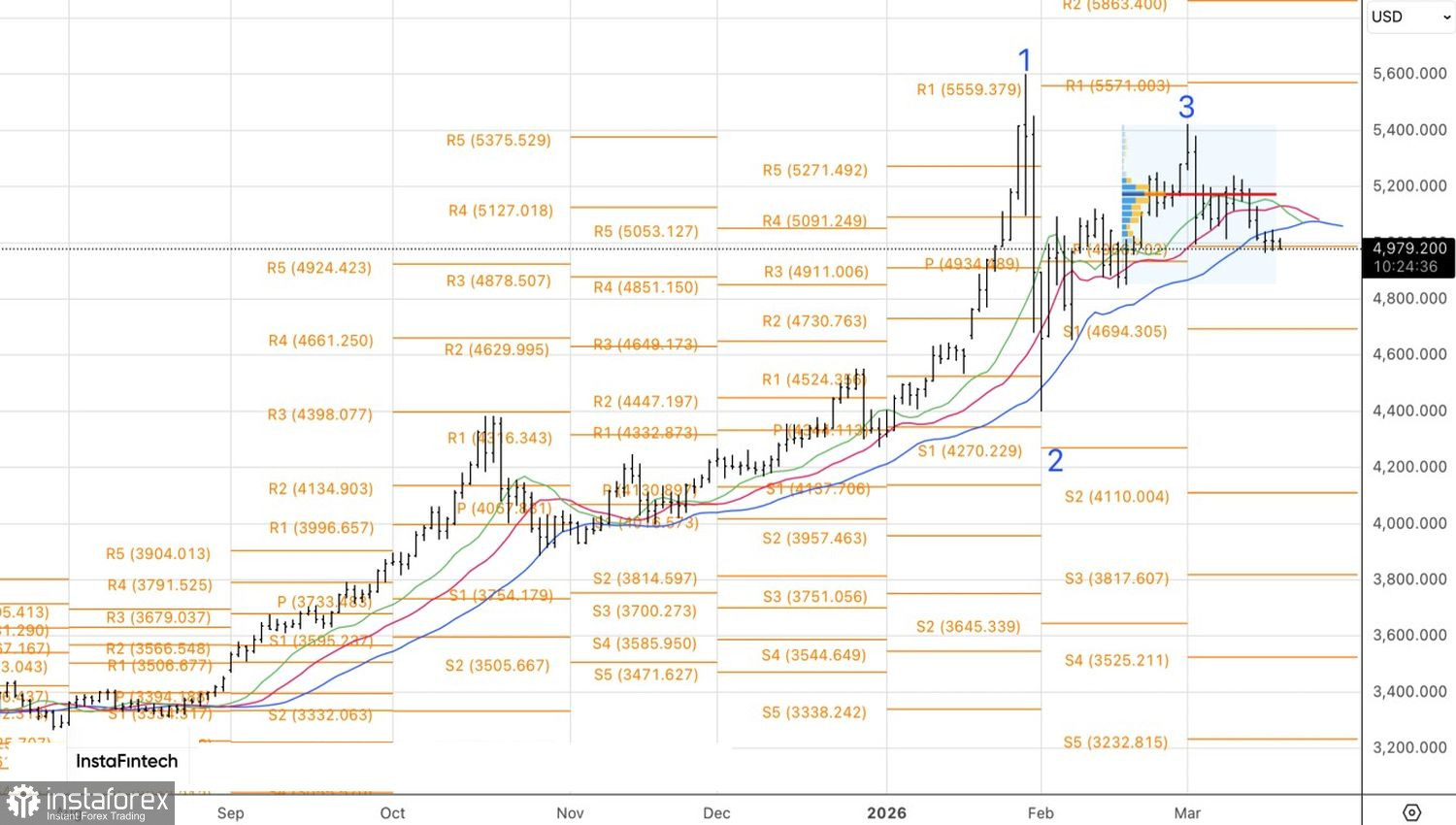 Технически на дневном графике золота имеет место отыгрыш материнского и дочернего паттернов 1-2-3. Так называемая «модель в модели» усиливает риски отката к восходящему тренду. Неспособность драгметалла вернуться выше $5000 за унцию станет поводом для продаж.